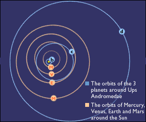 The star is called Upsilon Andromedae, it is about 45 light years away and remarkably like our Sun. It hit the headlines earlier this year as being the first star, other than our Sun, to be known to have more than one planet orbiting it. It has three.
