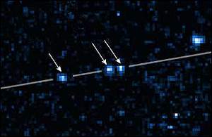The neutron star's trajectory was caught in three Hubble images taken in 1996 and 1999. The three images show it moving across the sky.
