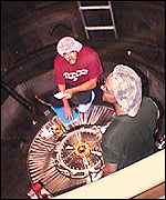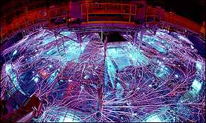 The experiments involve placing thin slivers of iron at the heart of the Z-machine where it is exposed to temperatures of more than one million degrees for a few billionths of a second. The electrons orbiting the atomic nucleii are stripped away and the iron becomes a super hot plasma radiating X-rays.